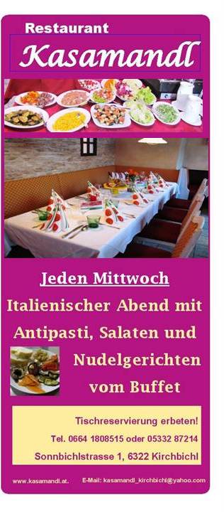Klassische Tiroler und internationale Gerichte in einem gemütlichen Ambiente erwarten den Gast im Restaurant Kasamandl. Die frischen und leichten Gerichte, variantenreich und auf typische Art zubereitet, laden zum Genießen ein. Unsere Speisekarte wechselt saisonal Selbstverständlich fehlt es nicht an den passenden Weinen aus ausgewählten Regionen Österreichs und Italien, sowie an einer großen Auswahl nichtalkoholischer Getränke . In der warmen Jahreszeit lädt unsere Terrasse zum Genießen ein. Freitags finden im Sommer immer unser Grillabend statt.